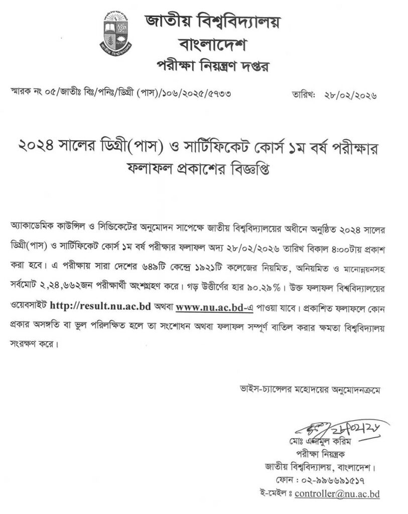 Degree 1st Year Result 2026 can be checked from here. National University has recently published NU Result Degree first year. This is the result for regular session 2024 candidates, irregular and grade improvement candidates. However, the passing rate, total passed candidate number and other information are mentioned in the press release published by NU.